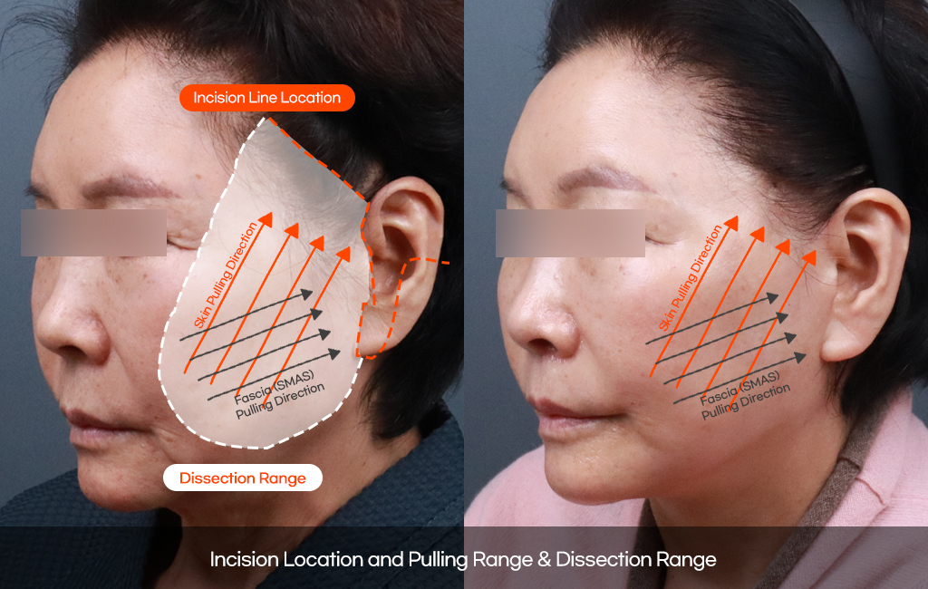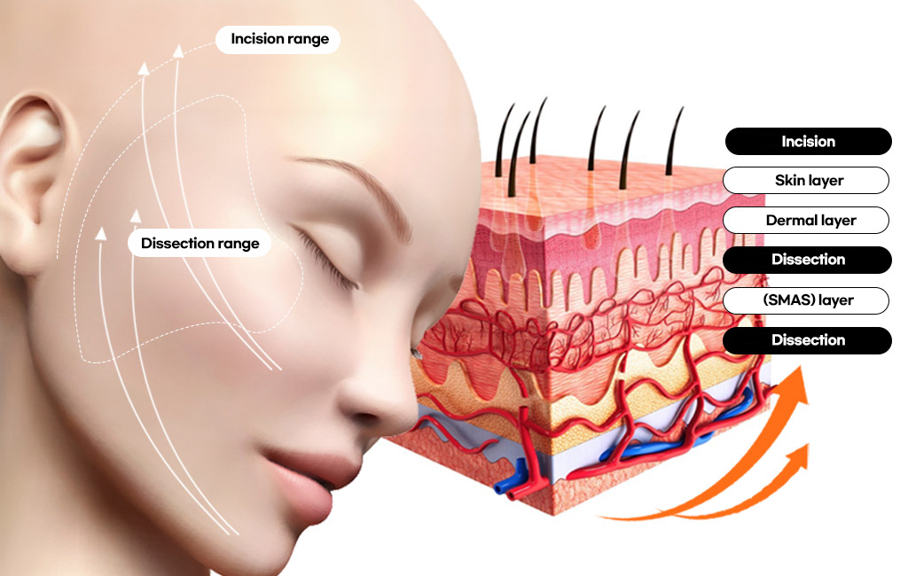new lifting is performed through deep dissection and precise SMAS layer dissection.