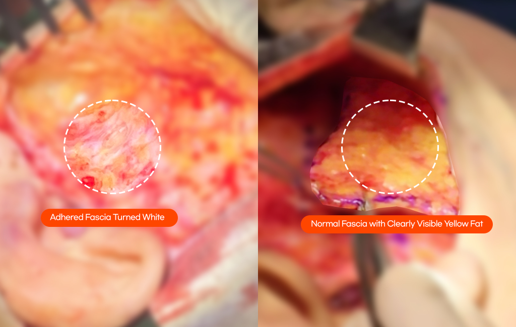 many adhered tissues and damaged fascial layers.