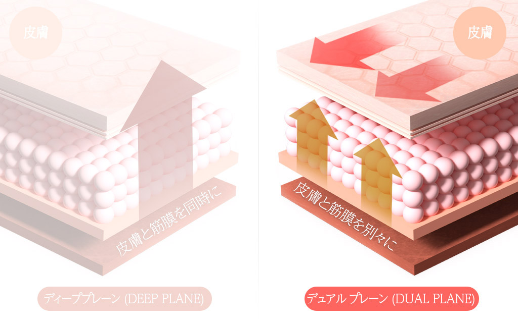 デュアルプレーン方式では筋膜と皮膚を別々の方向に引き上げることができます。