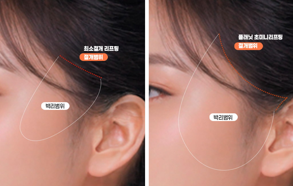 플래닛의 초미니리프팅은 측두근막을 기준으로 수술을 진행하며