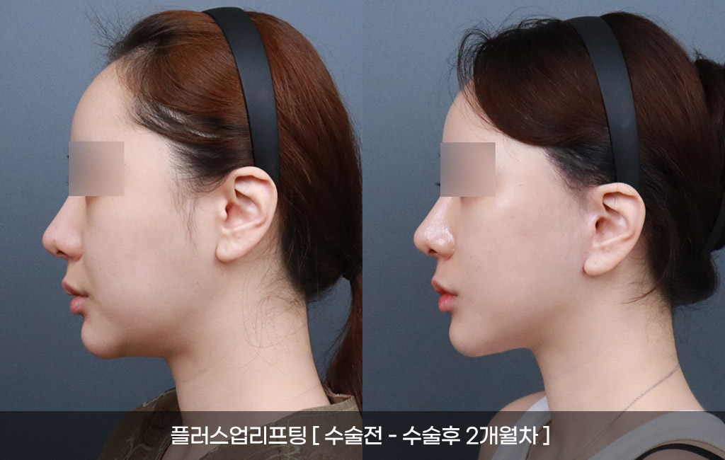 윤곽, 양악수술과 같이 뼈를 건드리는 수술은 시간이 갈수록 피부와 조직이 아래로 처지게 됩니다.플러스업리프팅은 처진 피부의 위치를 원래의 위치로 고정하며, 뼈를 건드리는 수술 후 줄어든 얼굴의 크기에 맞게 피부를 절제 하여 얼굴 라인을 만들어 줍니다.