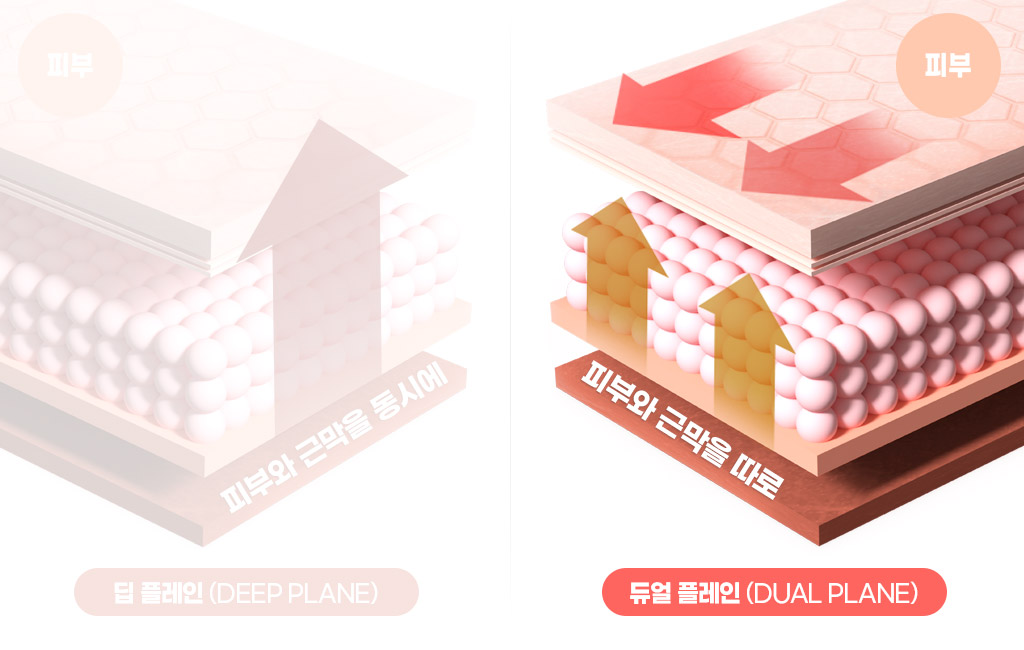 딥플레인은 근막과 피부를 동시에 당기는 반면,