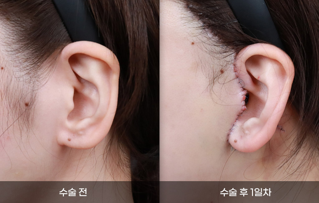 귀 앞쪽, 흉터가 겉으로 보이는 부분, 머리카락 안쪽,귀 뒤쪽까지 힘을 받는 피부층과 자연스러운 회복이 가능한 층까지