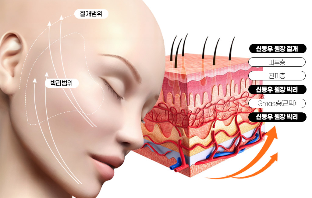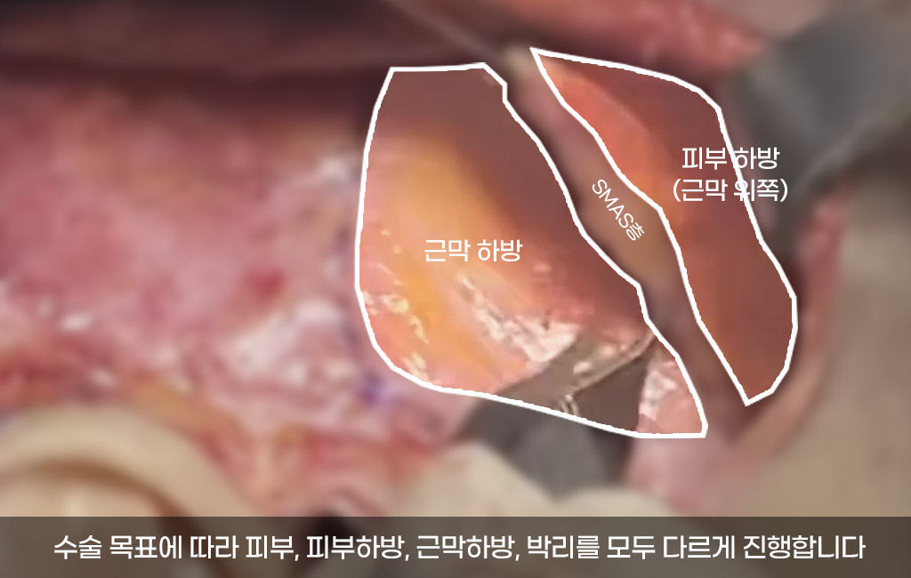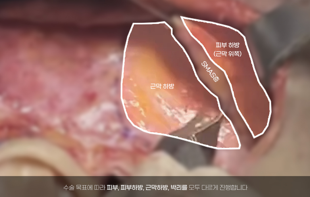 얼굴형에 따라 제약이 없도록 유지인대를 정확하게 끊어주고 신경과 혈관을 피해 유지인대 / smas 하부 / smas 상부 / 피부를 층층히 박리하여 원하는 위치로 이동시켜 처지고 늘어진 조직과 피부를 효과적으로 당겨줍니다
