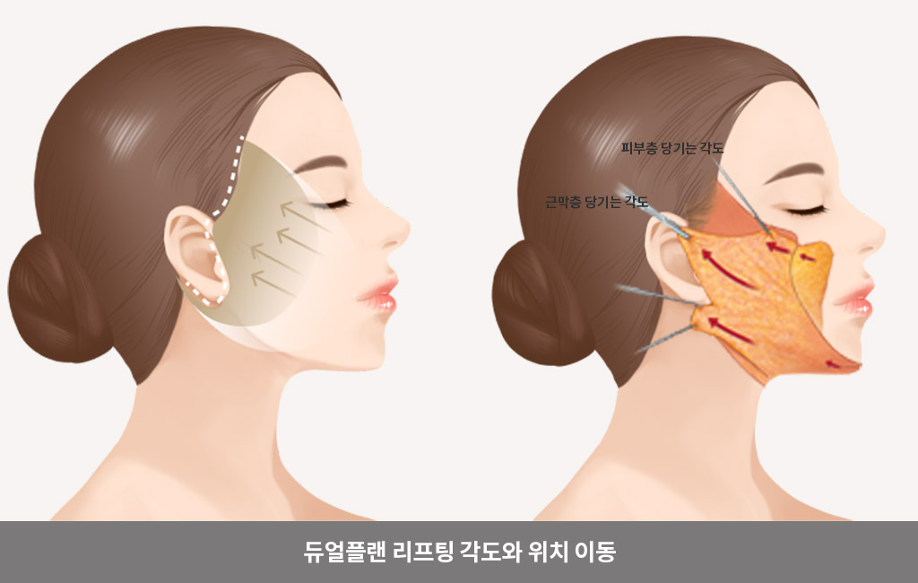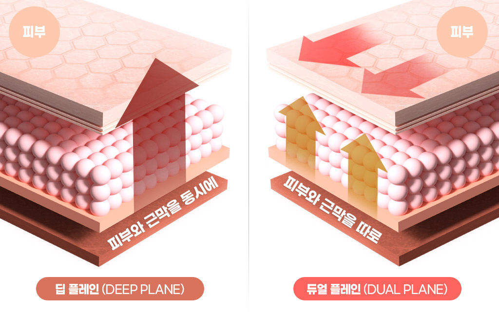 팔자주름,심부볼, 턱선,목라인 처짐에 대한 고민은 듀얼플레인 방식을 통해 전체적인 개선을 할 수 있으며,딥플레인 방식은 표층과 SMAS(근막층)을 동시에 이동시키는 방식으로,근육 위아래에 위치한 SMAS(근막층)을 당겨주기 때문에 더 강하고 오래 유지되는 효과가 있습니다.
