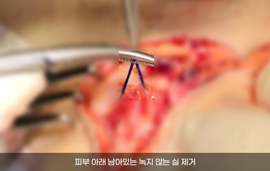 SMAS층만 당기며 이전에 실리프팅을 하셨다면 근막층 아래 깊이 들어간 실은 제거하여 울퉁불퉁하지 않게 일일이 확인해가면서 실을 제거합니다.